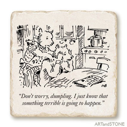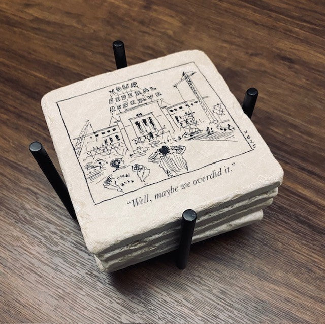 This quartet of coasters, featuring some of Jim's favorite cartoons by Hank Blaustein, will protect your tabletops with impeccable style. Coasters are printed in Southern California on distressed marble stones from Ephesus, Turkey. Each highly absorbent coaster has a non-slip cork backing and measure 4"X4". When coasters are not in use, store them in their simple and elegant iron stand.